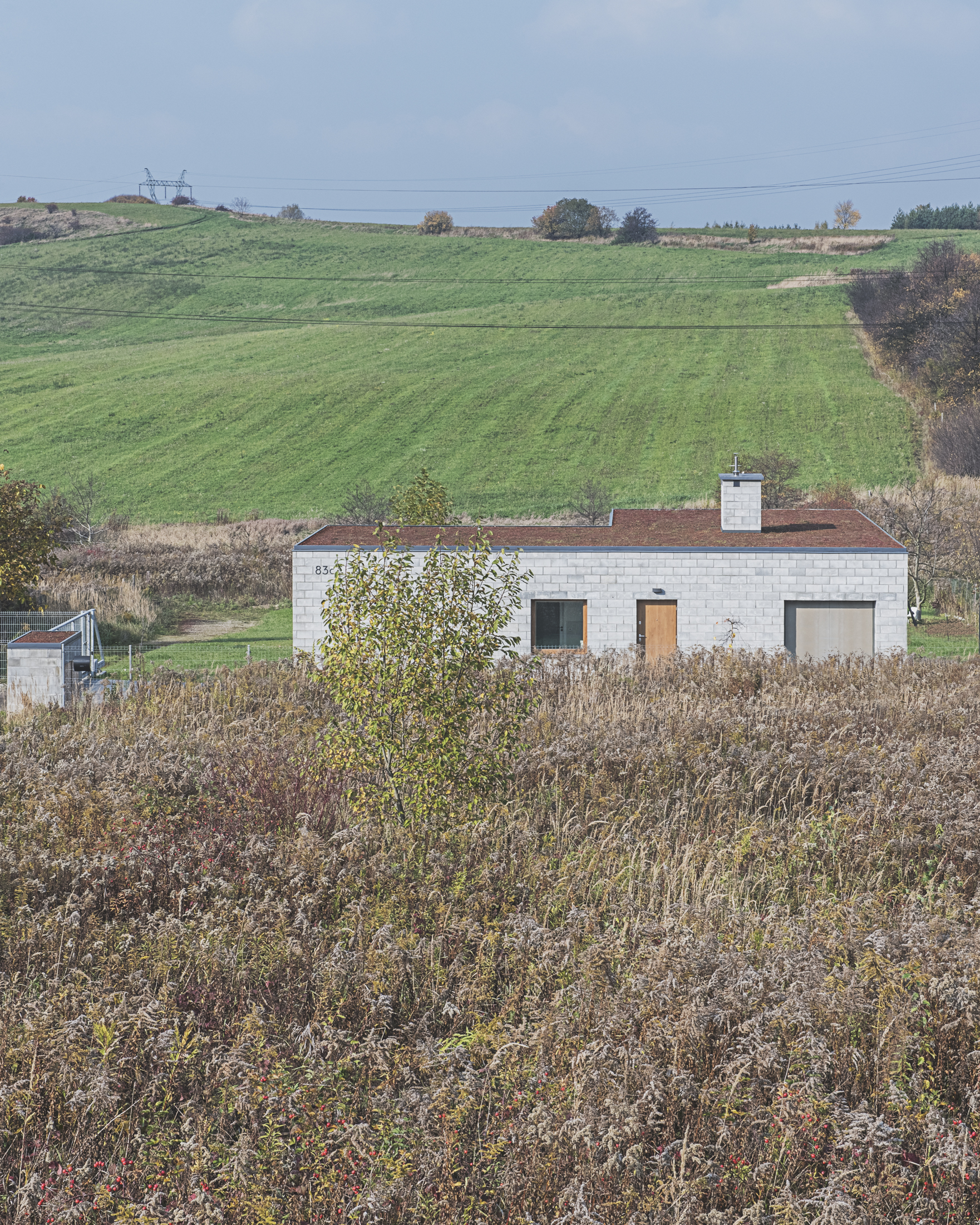 Dom zlokalizowany jest na pochyłej działce w Będzinie Grodźcu, powstałej w wyniku podziału większej parceli o pierwotnie rolniczym przeznaczeniu. Obniżający się teren od poziomu drogi głównej otwiera panoramę na przeciwległe zboczę Góry Parciny pokrytej dzikimi łąkami oraz polami, dlatego też nowy budynek przewidziano jako skromny, parterowy pawilon osadzony dyskretnie w rodzimym krajobrazie. Dom zaprojektowano docelowo dla typowej rodziny 2+3, przewidując w przyszłości możliwość zmian funkcjonalnych wynikających z dorastania dzieci. Bardzo duże ograniczenia w budżecie inwestycji wpłynęły na podstawowe decyzje projektowe, wymuszając rewizję praktykowanych sposobów budowania i wykańczania domów, ale jednocześnie pozwoliły na stworzenie rozwiązań podkreślających charakter domu, jego mieszkańców i lokalny kontekst. Wykonany przez Inwestorów w drugim etapie inwestycji ekstensywny dach zielony dopełnia pierwotne założenie nieznacznego wpływu powstałego obiektu na otaczający łąkowy krajobraz. Budynek zaprojektowano w systemie betonowych pustaków, z których wykonano fundamenty, ściany oraz elewacje, natomiast stropy założono jako prefabrykowane płyty kanałowe. Zastosowany materiał do murowania umożliwił realizację trwałych elewacji i jednocześnie otwartych dyfuzyjnie ścian zewnętrznych, bez konieczności stosowania drogiego systemu konsoli i kotew, standardowo montowanych przy budowie ścian warstwowych. Zastosowane materiały znacząco ograniczyły również roboty wykończeniowe oraz pozwoliły na prowadzenie instalacji bez widocznych ingerencji w ściany i stropy. Przyjęte rozwiązania projektowe zapewniły szacunkowo budowę domu z podstawowym wykończeniem na poziomie 2.5 tyś złotych za 1m2 i stosunkowo niewielkie koszty przyszłej eksploatacji.